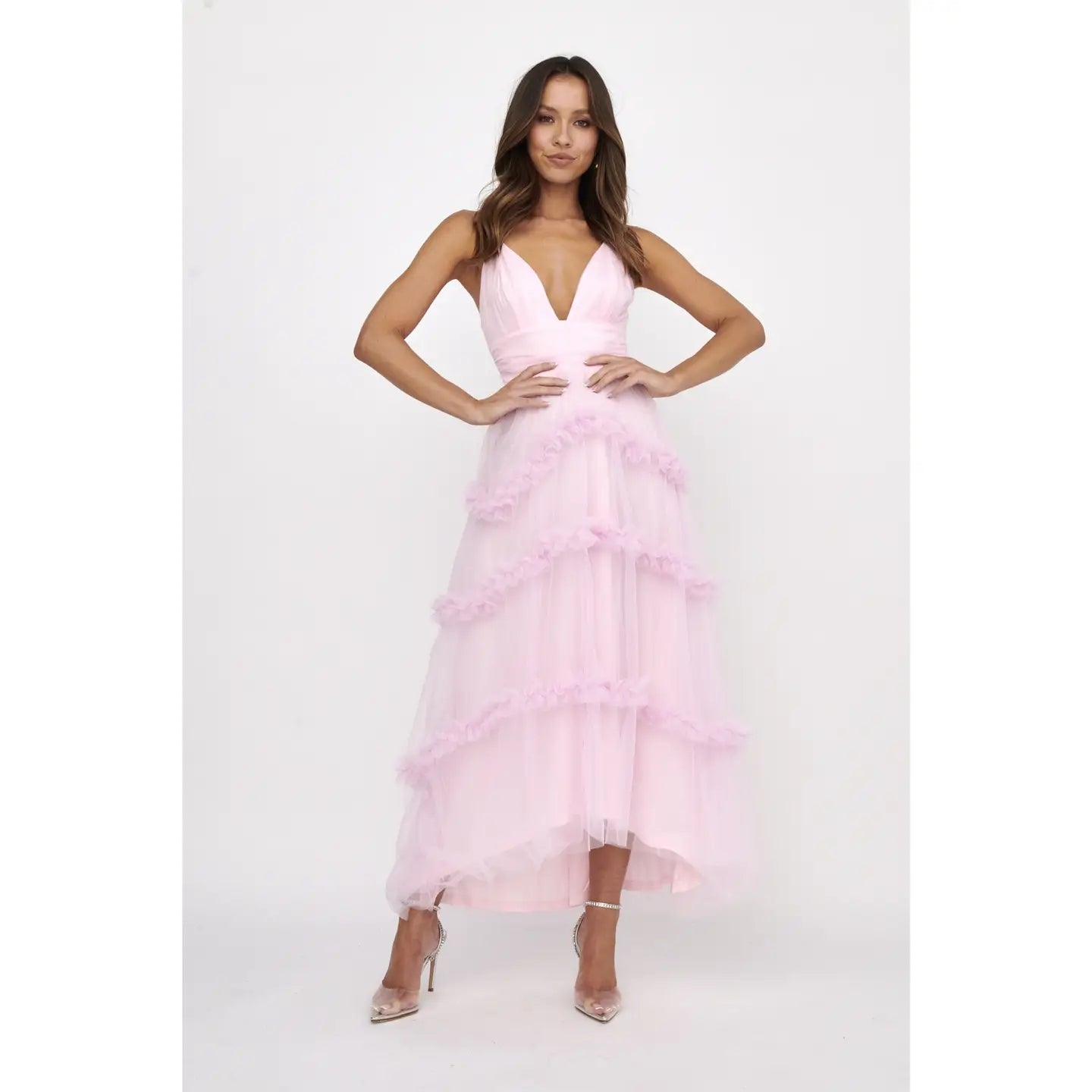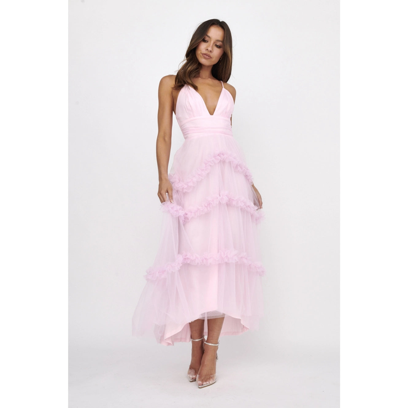 Deep V-Neck Tiered Tulle Midi Dress